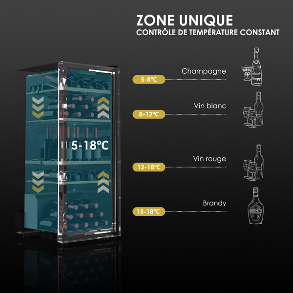 Conservez parfaitement votre collection grâce au refroidissement à monozone, offrant un contrôle précis et constant de la température pour différents types de vins