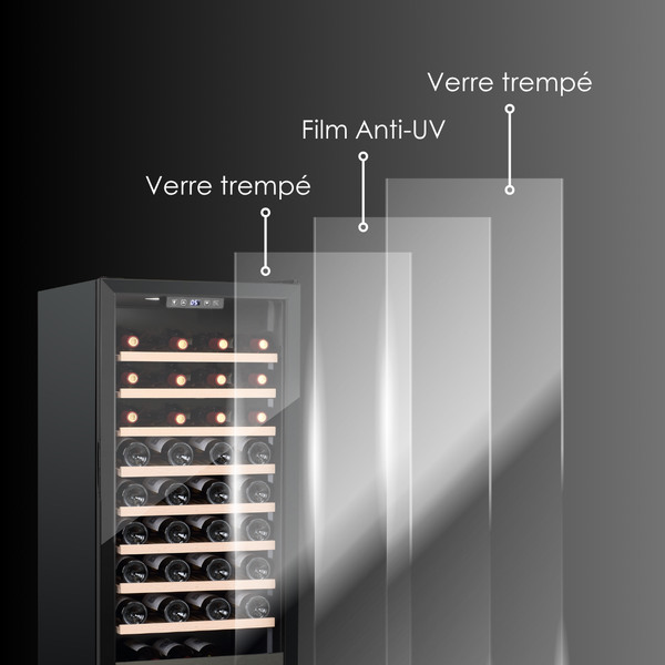 Le verre à trois couches fournit une protection de qualité, empêchant les rayons ultraviolets nuisibles de compromettre la qualité de votre vin et d'en prévenir la dégradation