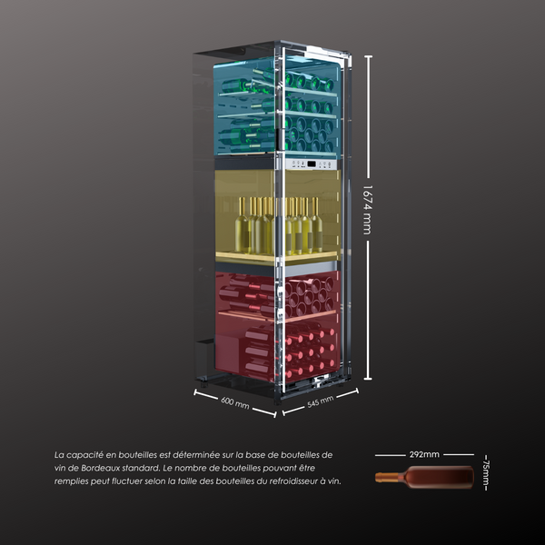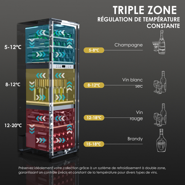 Optimisez la conservation de vos vins grâce à notre panneau de contrôle intuitif, conçu pour gérer trois zones indépendantes. Rouge, blanc ou effervescent, chaque type de vin bénéficie d'une température et d'une humidité sur mesure, garantissant des conditions parfaites pour chaque bouteille