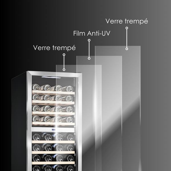 Dotée d’un triple vitrage anti-UV, cette cave à vin triple zone protège vos vins des rayons nocifs tout en maintenant une isolation thermique optimale pour chaque compartiment. Conservez vos rouges, blancs et effervescents dans des conditions parfaites, tout en préservant leurs arômes et leur qualité