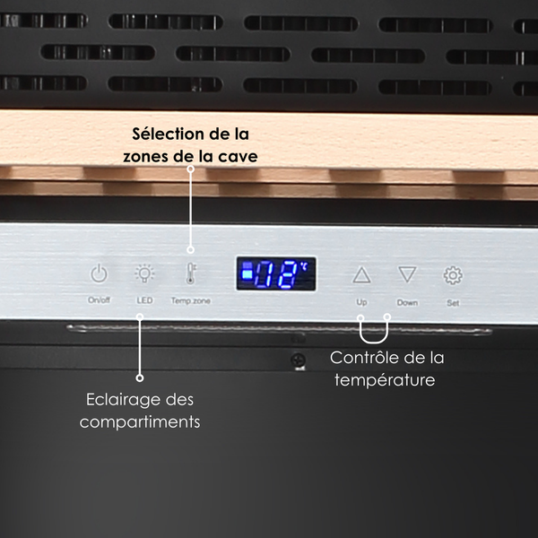 Optimisez la conservation de vos vins grâce à notre panneau de contrôle intuitif, conçu pour gérer trois zones indépendantes. Rouge, blanc ou effervescent, chaque type de vin bénéficie d'une température et d'une humidité sur mesure, garantissant des conditions parfaites pour chaque bouteille