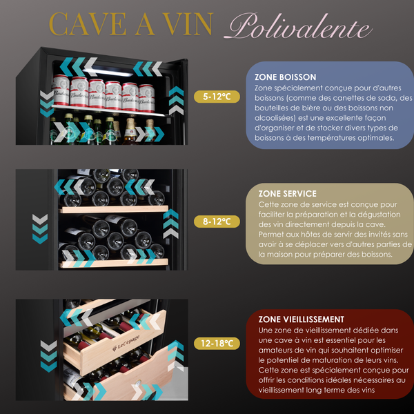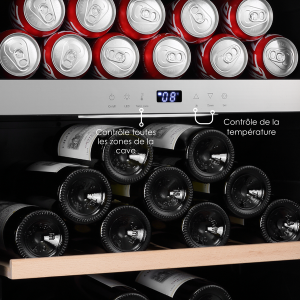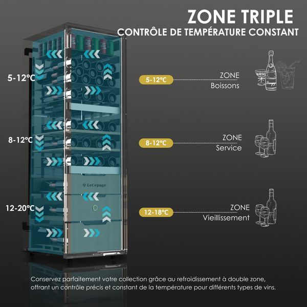 Équipée d’un panneau de contrôle LED numérique intuitif, cette cave à vin triple zone vous permet de régler facilement et avec précision la température de chaque zone. Offrez à vos vins un soin sur-mesure en toute simplicité