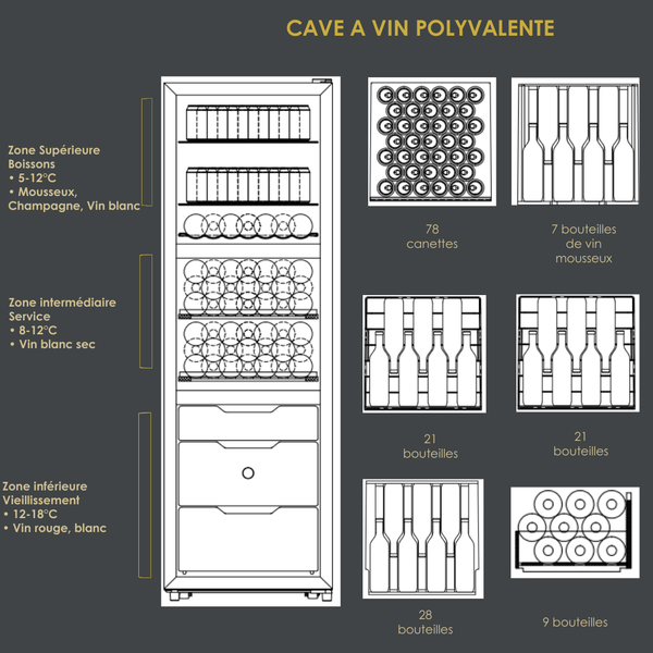 Grâce à sa conception triple zone, cette cave à vin offre une solution idéale pour conserver vos vins rouges, blancs et effervescents à des températures parfaitement adaptées. Une flexibilité inégalée pour sublimer chaque bouteille selon ses besoins spécifiques