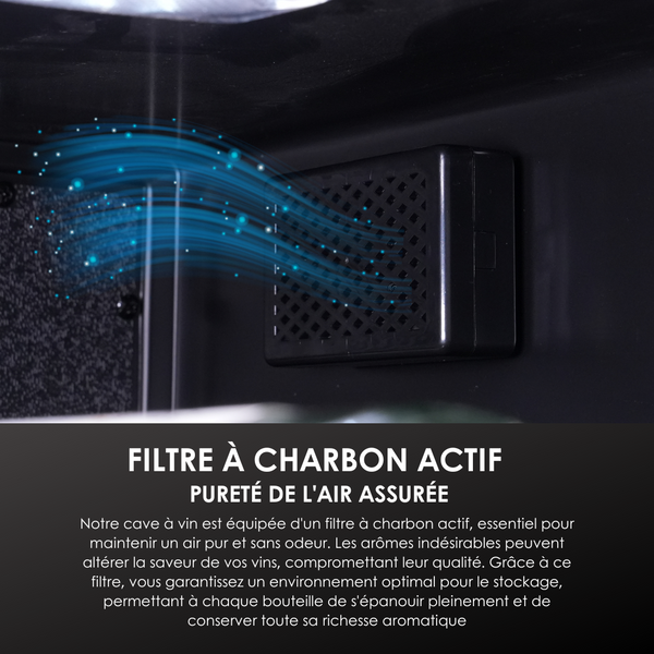 Le filtre peut efficacement éliminer la poussière, les pollens, la fumée et autres particules en suspension dans l'air,maintenant l'air à l'intérieur de la cave à vin propre. Il n'est donc pas nécessaire de nettoyer fréquemment la cave. Un air propre contribue à conserver le goût et la qualité du vin, et peut également réduire la contamination du bouchon