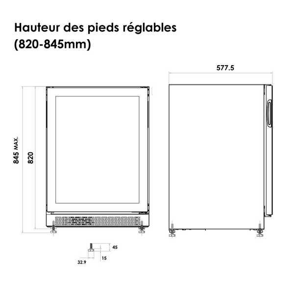 Les pieds réglables permettent d’ajuster facilement la hauteur de votre cave à vin encastrable pour une parfaite intégration, quel que soit l’espace ou le mobilier